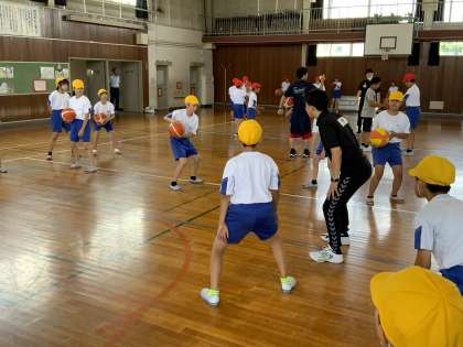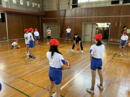 バスケットボール教室が行われ、プロバスケットチーム「グラウジーズ」から小野龍猛選手とスタッフの方々が来校されました。子供たちはプロ選手の指導の下、基礎基本の練習に汗を流していました。練習の後は、小野選手に質問する子供たちの姿も見られました。充実した学習の機会をくださり、ありがとうございました。