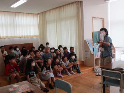 今日は図書室で本の貸し出しを行い、司書の先生から読み聞かせもしていただきました。一生懸命話を聞き、物語の中に入り込んでいました。
