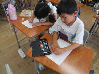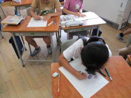 今週はコースを変えて2回目の町探検です。前回とは違った町並みを感じながら、藤ノ木にある素敵を見付けようとしていました。学校に帰ってからは、忘れないように丁寧に振り返りカードを書きました。