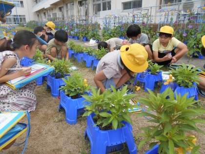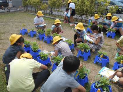 5月に植えたホウセンカがぐんぐんと育ってきました。植物の生長を感じながら、色・形・大きさの観点で観察しました。
