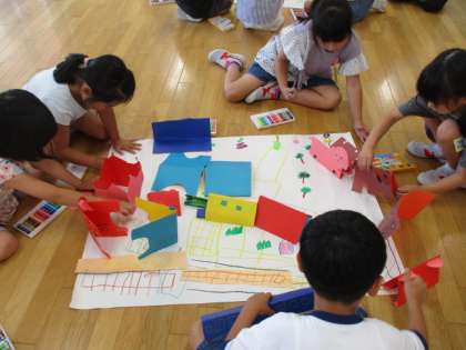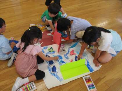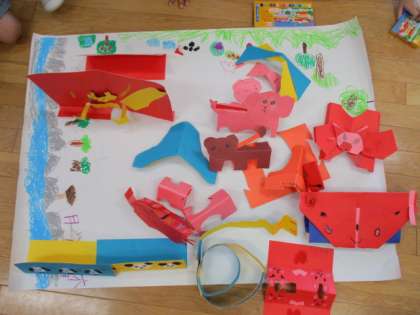 厚紙を折って、立たせ方を工夫し、生き物や建物等を作りました。その後、みんなで作ったものを大きな紙に並べ、背景を描いて楽しみました。
