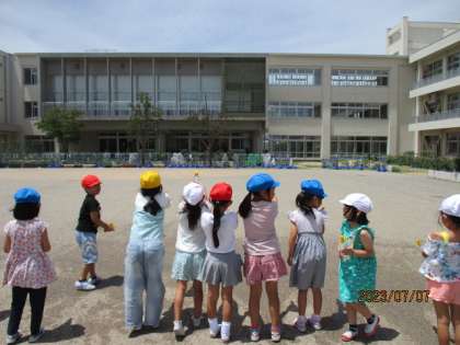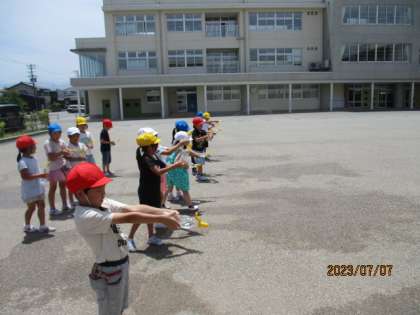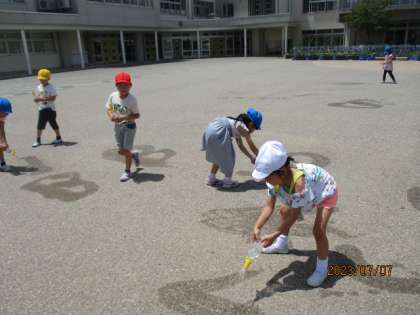 ペットボトルを使って水がどこまでとぶか試したり、コンクリートに絵を描いたりしました。暑い日でしたが、少しだけ涼しい気持ちになりました。