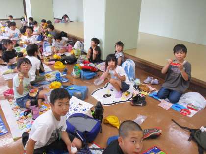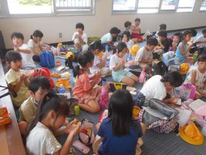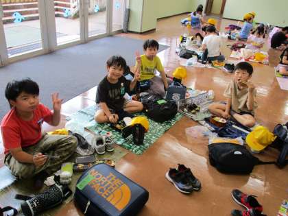 昼食の様子です。気温が高く、屋内での昼食となりました。お家の方が作ってくれたお弁当を開けたとき、子供たちはニコニコの笑顔でよろんでいました。朝早くから、子供たちのために美味しいお弁当を作ってくださり、ありがとうございました。