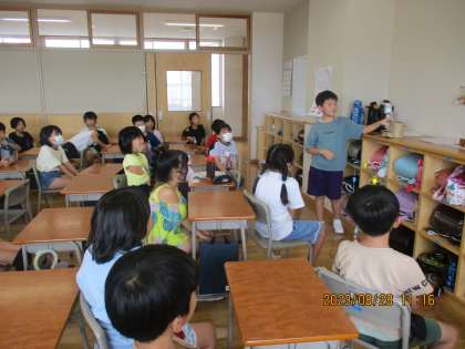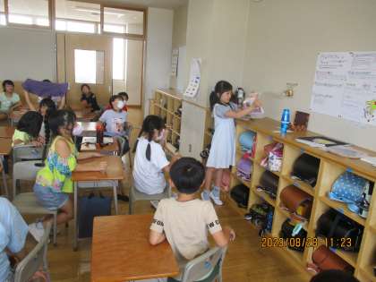 夏休み中に頑張って作った工作や自由研究の発表をしました。