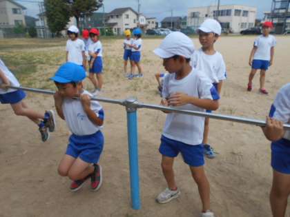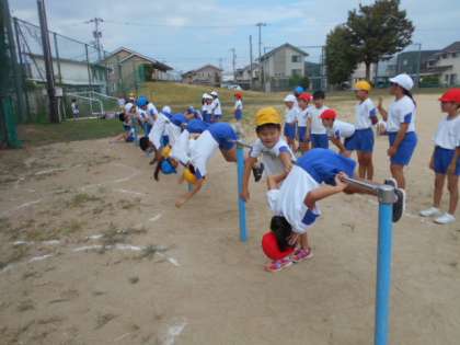 鉄棒にぶら下がったり、「ふとんほし」という技をしたりして、ウォーミングアップをしています。こうした動きを続けて、逆上がりなどの技につながる筋力や感覚を身に付けます。