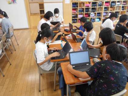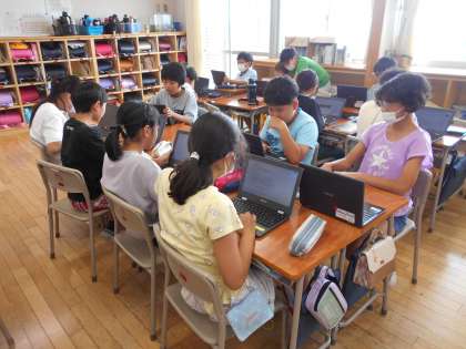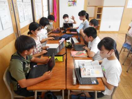 対話の練習として「どちらを選びますか」の学習をしています。2つの意見のどちらがよいか討論形式で話合いをする学習です。まずは、それぞれの意見を発表する際、説得力のある意見となるように事実や資料を調べ、友達と内容を吟味していました。