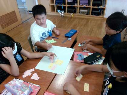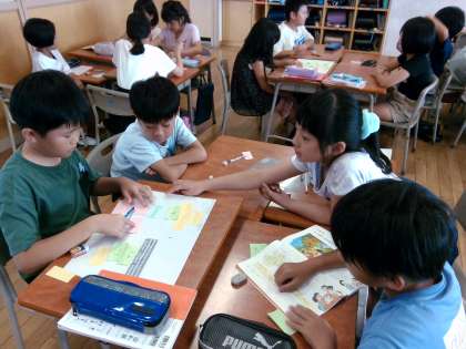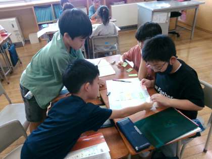 国語科の学習で「対話の練習」の学習をしました。三日間、山小屋で過ごすという設定で、やりたいことや持って行きたい物について、話し合いました。付箋を動かして仲間分けしながら、話し合いを進めました。