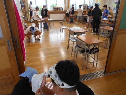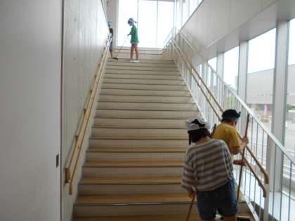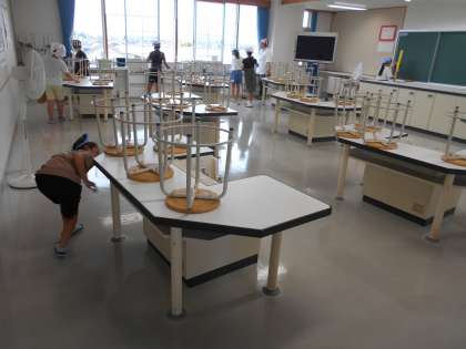 5年生では、三角巾をきちんと付け付けて、一生懸命に清掃に取り組むことを指導しています。子供たちは、時間通りに掃除を始め、黙々と掃除に取り組んでいます。