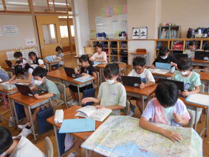 2学期の課題「見つけたよ!とやまのじまん」を本、パンフレット、インターネットを使って調べました。また、インターネットで調べる時のポイントを確認しました。