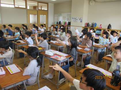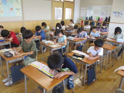 毎日、新出漢字の学習をしています。空書きをしてから、ていねいにドリルに書き込んでいます。「はらい」は「シュー」、「はね」は「ピョン」と声に出して空書きしています。
