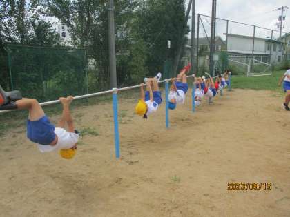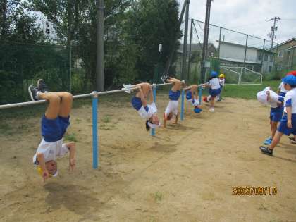 体育の時間、晴れた日には鉄棒運動をしています。簡単な技から始めて、少しずつ難しい技にチャレンジしています。