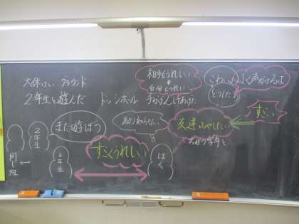 この日に話してくれた子は、「昨日の休み時間にグラウンドで話したことのない2年生の子とドッジボールをした。そしたら、2年生が『また、遊ぼうね』と言ってくれたことがとてもうれしかった」と話しました。聴いていた子からは、「知らない子に声をかける勇気がすごいね」「僕も友達をもっと増やしたいと思った」などと上学年として、下学年に関っていこうとする心の芽生えを感じられました。