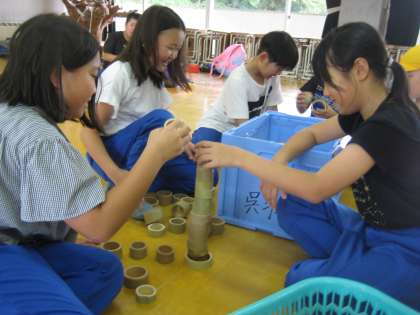 呉羽青少年自然の家に行きました。班の仲間と協力し、自然の中での活動を全力で楽しみました。バンブーチャレンジの様子です。