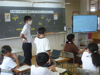 社会科の学習では、「天下統一に向けての働きが、より大きかったのは信長か秀吉か」について話し合っています。子供たちは自分で考えた仮説について、調べ学習に取り組んだり友達と意見を交換したりして、考えを広げていました。