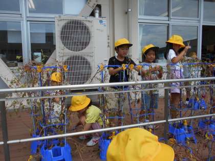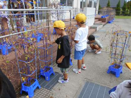 思い出として残すためにつるを切る前の写真を撮った後、一人一人リースを作りました。「あさがおとのおわかれが寂しい」と言う子もいれば、リースができたら「綺麗にできて嬉しい」と言う子もいました。新しくできた種も大事にとりました。