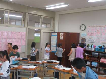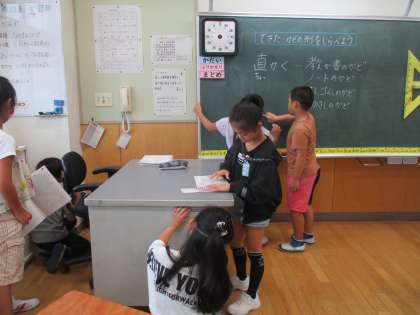 算数科では、直角を学習し、教室の中や身の回りにあるもののどこに直角が隠れているか、みんなで探しました。様々なところに直角があることに気付きました。