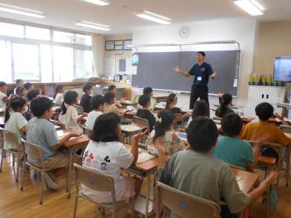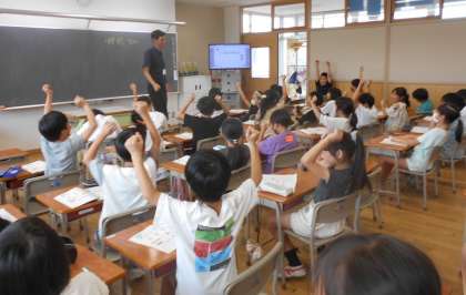 外国語活動では、好きなものの尋ね方を練習しました。ALTの好きな食べ物やスポーツについて予想した子供たちは、関心をもって聞いていました。