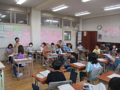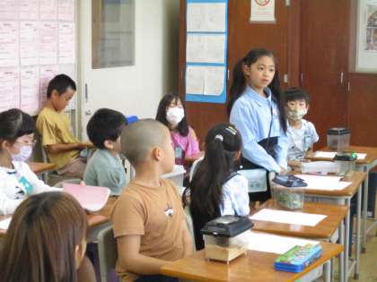 今日は、しばらく生き物と一緒に過ごしてみて、今どんなことを考えているのか話し合いました。「わくわく」「ドキドキ」「いやいや」など、様々な気持ちになっていることが分かり、なぜ、そのような気持ちになっているのか、みんなで詳しく聴き合いました。「苦労してつかまえたのに、死なせてしまって、どうしていいのか分からない」「友達になろうとは思うけれど、相手のことをよく知らないからしっかり調べてみたい」など、子供たちの生き物としっかり向き合う姿が見られました。