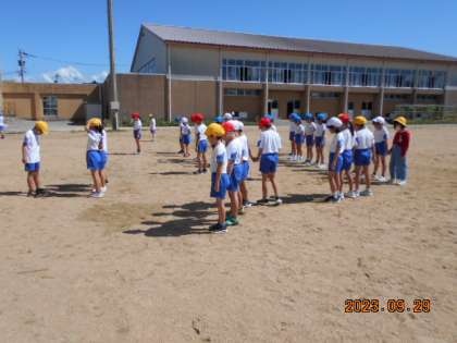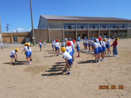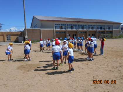 体育の後、かげおくりをしました。「ひとうつ、ふたあつ、みいっつ」と、みんなで声を合わせて数を数え、「とお」で空を見上げました。青い空に自分たちの影を見付けて「見える見える」と声を上げていました。