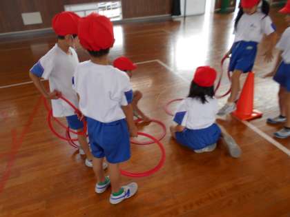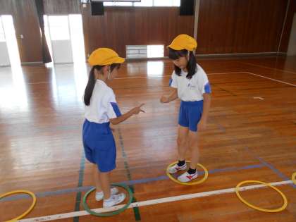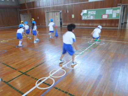 各団、ラバーリングを工夫して並べ、ケンケンパをしたり、チームに分かれてドンじゃんけんゲームをしたりしながら、楽しくとびあそびを行いました。