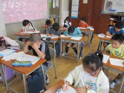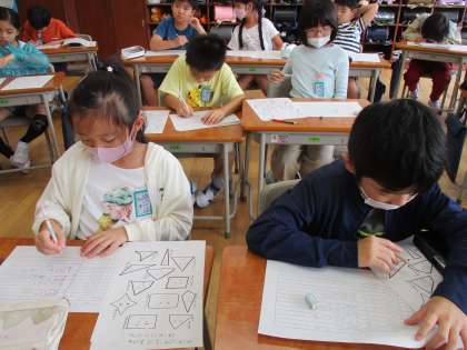 三角形と四角形の特徴を捉え、仲間分けができるようになってきました。まとめとして、「三角王女と四角大王からの挑戦状」に取り組みました。ハチャメチャ大王が放ったスパイに引っかからないように気を付けながら、三角形と四角形を見付け出しました。
