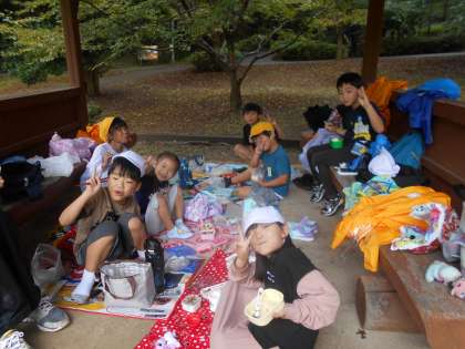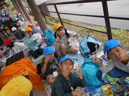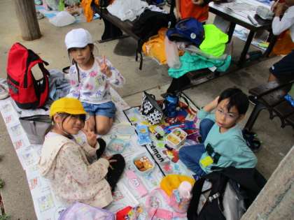 昼食時は雨もやんでいましたが、屋根のあるところでお弁当をいただきました。子供たちは、うれしそうに弁当箱を開き、「おいしい!」と言いながら食べていました。