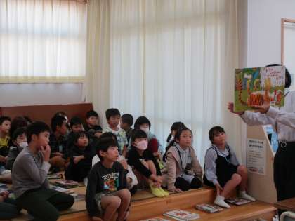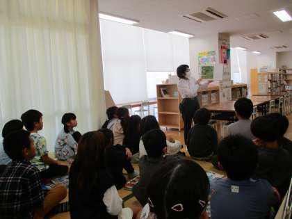 司書の横山先生に今日は「トラのじゅうたんになりたかった トラ」を読み聞かせしてもらいました。絨毯の上で幸せそうに過ごす王様の家族に憧れ、自分も絨毯になって仲間になりたいと願い、トラの絨毯のふりをして王宮に入り込んだトラの楽しいお話に子供たちは夢中になっていました。