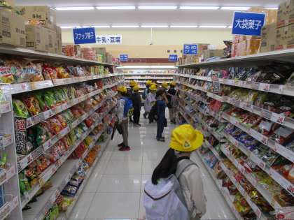 また、Vドラック藤ノ木店では、お店の中を見せていただきました。たくさんの商品が並んでいて、子供たちはとても驚いていました。活動を終えた際に、インタビューで知ったことを子供たち同士で伝え合い、他グループの子供たちに学びを共有する様子も見られました。