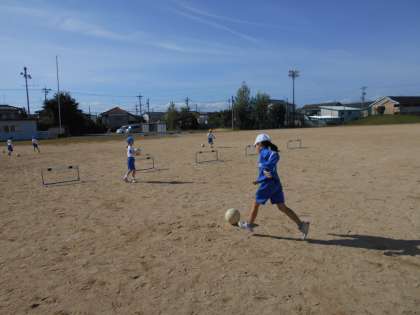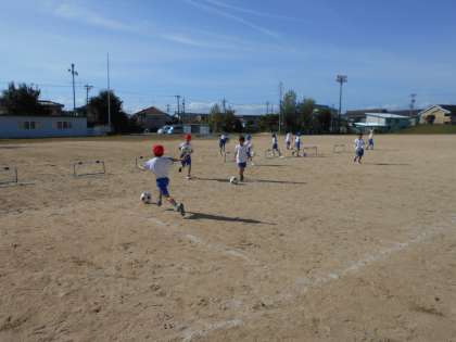 ボールを蹴るだけでなく、止めたり小さいゴールに入れたりする練習もしました。天気も良く、思いっきり体を動かすことができました。