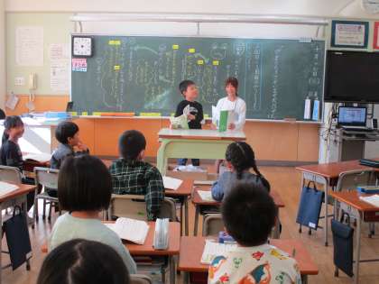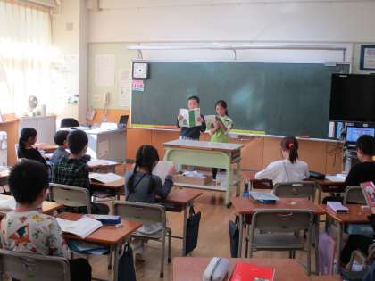手紙が届くことを諦めきっている「がまくん」と、そんな「がまくん」を何とかして玄関外に誘いたい「かえるくん」とのやり取りを音読で表現しました。やる気をなくしている「がまくん」や、サプライズを成功させようと燃えている「かえるくん」の様子を上手に音読で表していました。