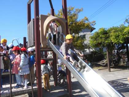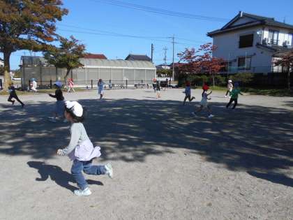 広場でけいどろをしたり、ドングリを拾ったりして、楽しく遊びました。青空の下、思いっきり体を動かせて喜んでいました。遊具を使うときには、順番を守って遊んでいました。