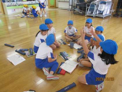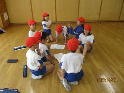 学習発表会で演奏する「エーデルワイス」の曲に合わせて、振り付けを考えました。エーデルワイスの写真を見て、イメージを膨らませたり、言葉で表したりしたあと、団ごとに別れて考えました。最後にみんなで見合いました。