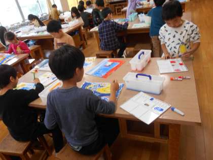 図画工作科「おはなしから うまれたよ」では、お話を聞いて、自分の好きな場面を絵に描いています。今日は、絵の具を使って背景を丁寧に塗りました。