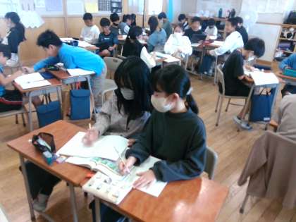 国語科「固有種が教えてくれること」の学習では、説明文に出てくる資料をもとに、筆者が伝えたいことについて考えました。ペアで教科書をよく読み、ノートにまとめました。