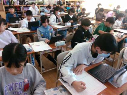 書写の学習では、記事やネットニュースの内容を自分で選び、オリジナルの新聞にまとめる学習をしています。文字の大きさを変えたり行をそろえたりするなど、新聞が見やすくなる工夫を考え制作しています。