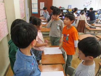 町探検付け付けたことや感じたことの中から、「みんなに知らせたいベスト2」を紹介し合いました。発表する子供たちは、自分たちの見付けたすてきを伝えようと、お店で働いている人の気持ちを話したり、聞きに来た人の質問に答えたりしていました。発表を聞いた子供たちからは、「中学校に行くのが楽しみだな」「わたしもパンやさんになりたいな」などの声が聞こえてきました。
