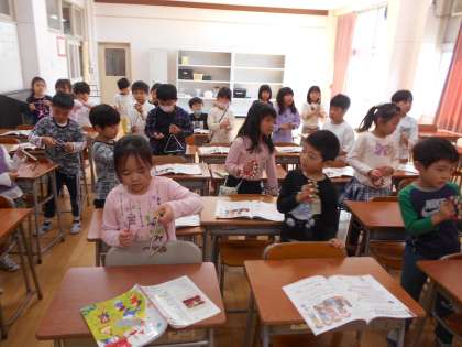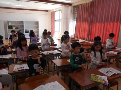 音楽科「がっきとなかよくなろう」の学習では、「さがしてみよう ならしてみよう」の曲に合わせて、すずやトライアングルを選び、音をならして楽しみました。