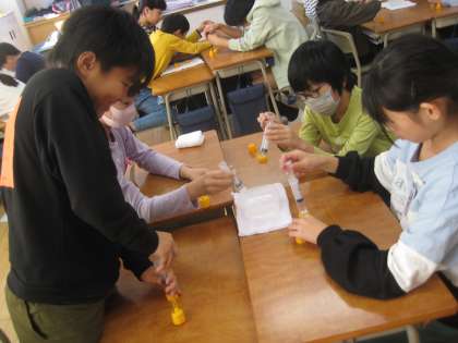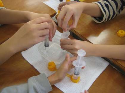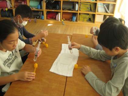 前回、注射器に空気を閉じ込めました。今回は、水を閉じ込めました。「かたい」「押せない」と言いながら、空気との違いを学習しました。