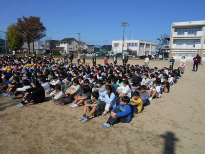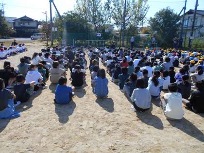 避難訓練の様子を消防士の方に見ていただき、講評をいただきました。「お・は・し・も」を守ってきちんと避難すると共に、真面目な表情で話を聞いていました。