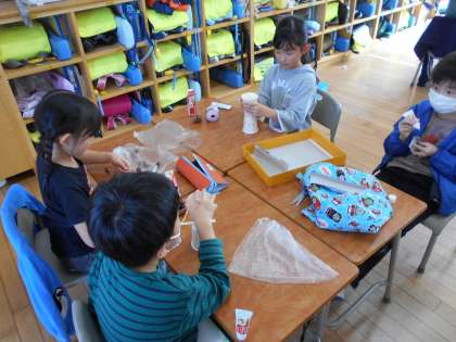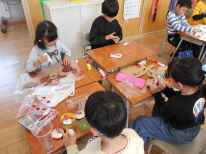 生活科では、どんぐりやまつぼっくり、イチョウ等をつかって、こまやけんだまをつくって楽しんでいます。「作る」、「遊ぶ」、「直す」を繰り返しながら、もっと楽しく遊ぶ方法を考えてきます。
