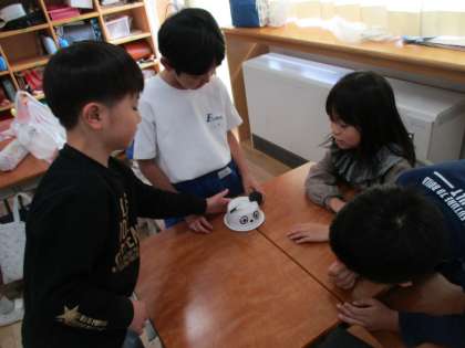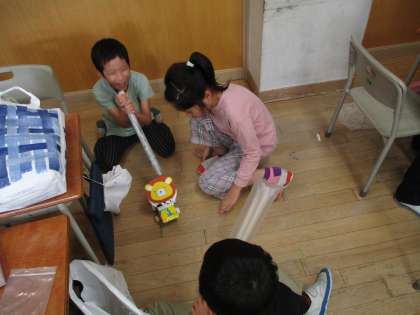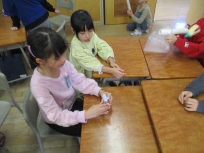 生活科の学習では、風やゴムなどの力を利用して、動くおもちゃ作りを進めようとしています。この日は、先生たちで作ったおもちゃで遊んでみました。「どのように動くのかな?」「作り方の工夫は何かな?」など、遊びながら考え、これからのおもちゃ作りに生かそうとしていました。