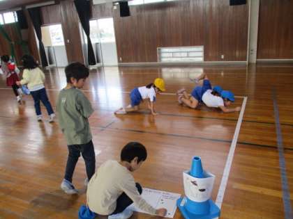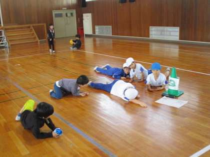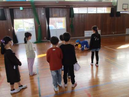 2年生の体育科の表現運動でつくった動物園に招待していただきました。動物になりきって表現している2年生を見て、すごいと驚いている1年生でした。また、本物の動物のように動く2年生に感心して、一緒に動物の動きをして楽しむ1年生もいました。