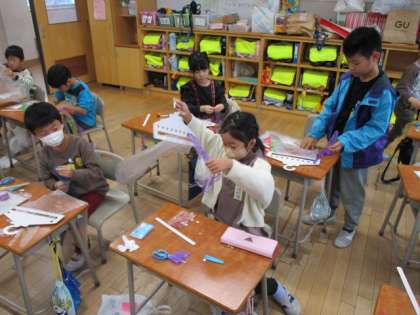 図画工作科「ひらひら ゆれて」では、ゆれると楽しい飾りを考えてつくっています。紙ハンガーにナイロン袋やテープを付けて、自分のイメージに合うかざりをつくろうと楽しんで活動しています。