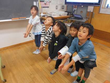 今日は、「人」という漢字がどのようにできたかを実際に体を使ってやってみていました。