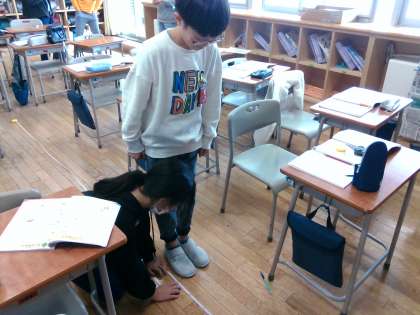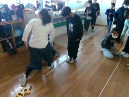 自分の歩幅を平均の学習を使って計算をし、教室から特別教室までの距離を測りました。