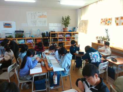 文章の要旨をとらえて、150字程度でノートにまとめました。子供たちは、班の仲間と相談して筆者の言いたいことは何かを考えました。