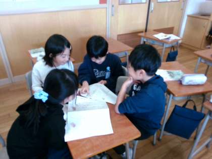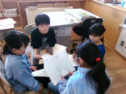 国語科で学習した「すがたをかえる大豆」のように、すがたをかえて食品になる材料について調べ、説明文を書きました。その説明文を、グループで読み合いました。自分が調べた材料と違う説明文や同じ食品でも例に挙げている食品が違う説明文と、自分が書いた説明文との違いに注意して聞いていました。