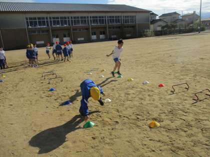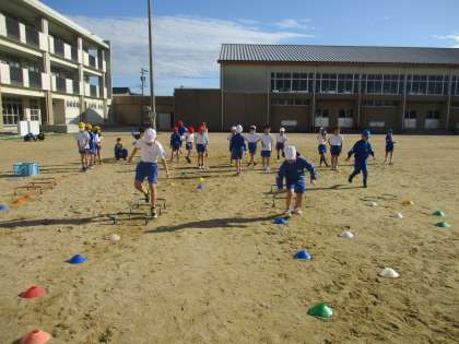 体育の学習では、いろいろなコースを走って楽しんでいます。今日は団ごとに自分たちでコースを考えました。ハードルを置いてたくさんジャンプするコースを作ったり、輪っかを置いてケンケンパをするコースを作ったりなど、工夫しながら楽しく走る運動に取り組みました。