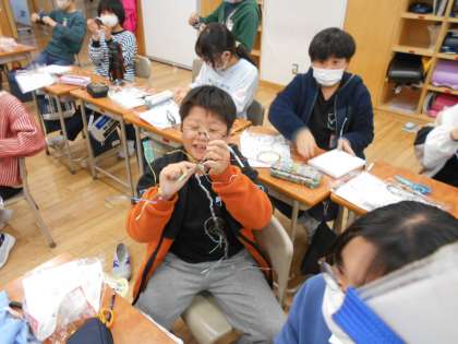 ワイヤーを使った立体作品に挑戦しています。今日は、注意する点やどのような工夫が望ましいかを確認し、楽しみながら活動しました。