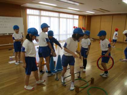屋内でも、コーンやハードルの様々な並べ方を試しながら、「ぐるぐるコース」「高くジャンプコース」などのコースをつくり、運動に取り組みました。